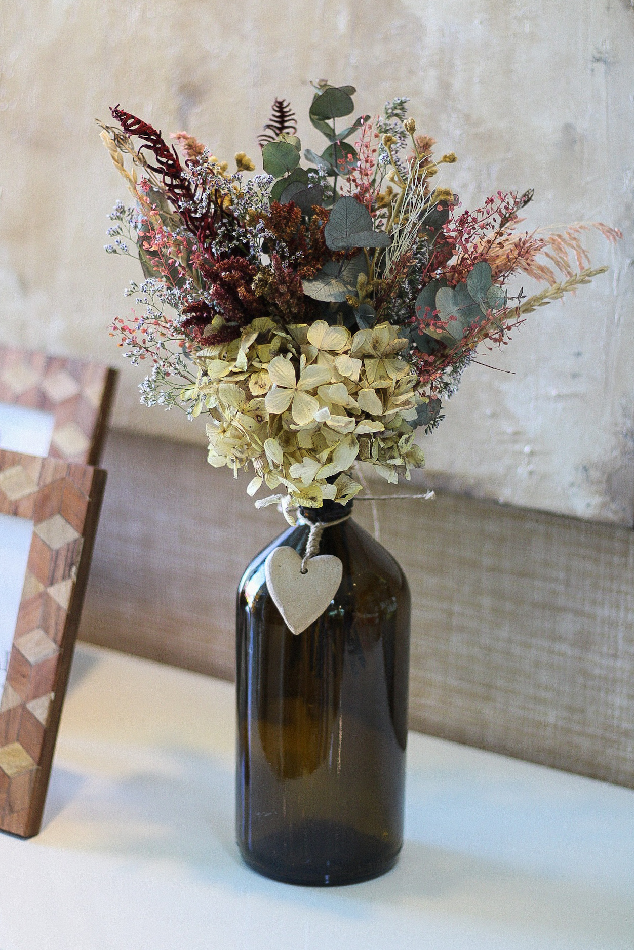 Este arranjo elegante e atemporal traz o charme das flores secas em perfeita harmonia. Montado em uma garrafa âmbar translúcida, o buquê é composto por flores secas em tons neutros e verde, criando uma paleta suave e aconchegante. O acabamento em coração de cerâmica reforça o charme e o caráter afetivo da peça, tornando-a perfeita para presentear ou compor a decoração de qualquer estação.