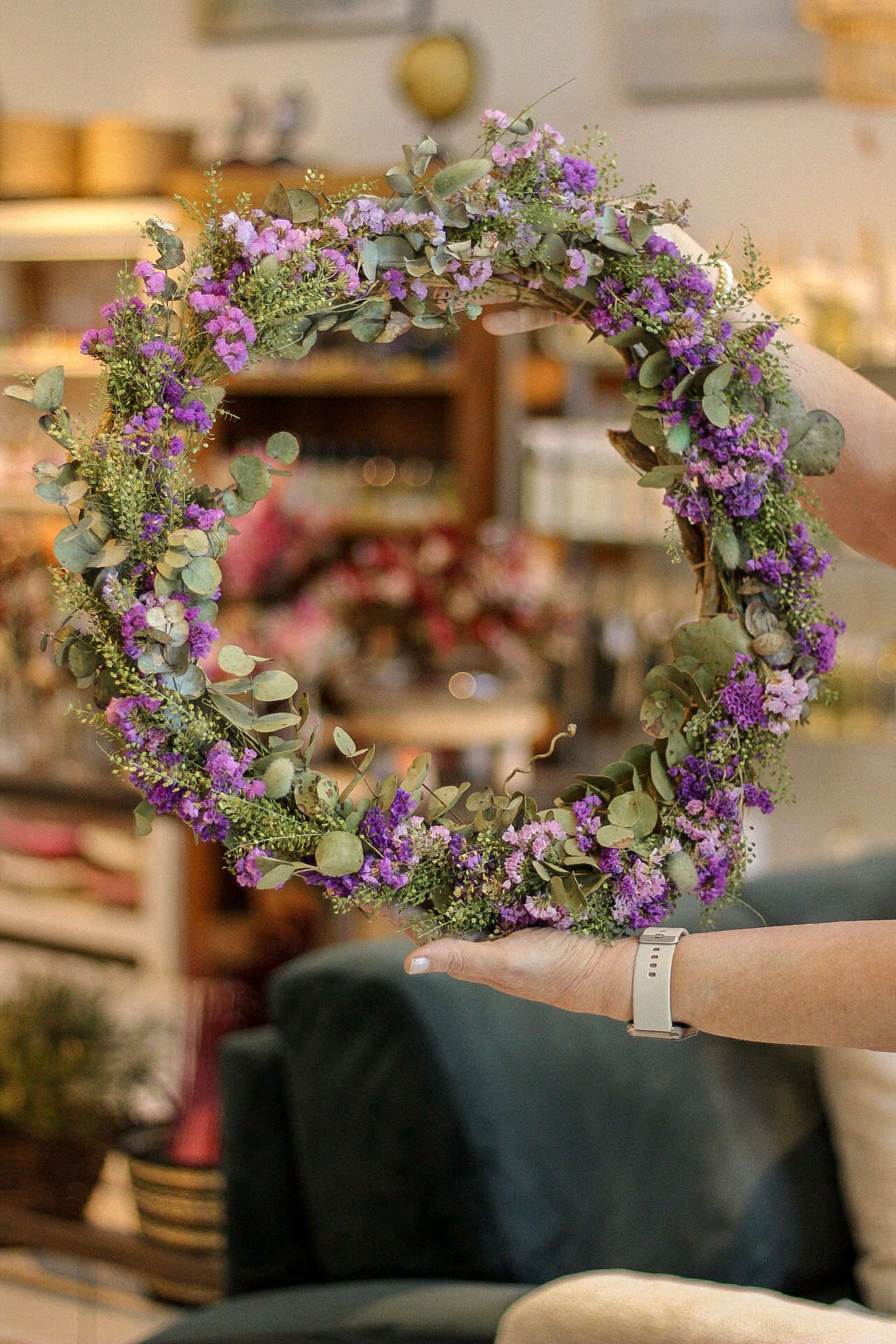 Delicada e encantadora, esta guirlanda artesanal combina flores naturais desidratadas em tons de lilás com ramos de eucalipto e sementinha. Ideal para decorar portas, paredes, ela traz um toque de elegância e acolhimento ao ambiente.