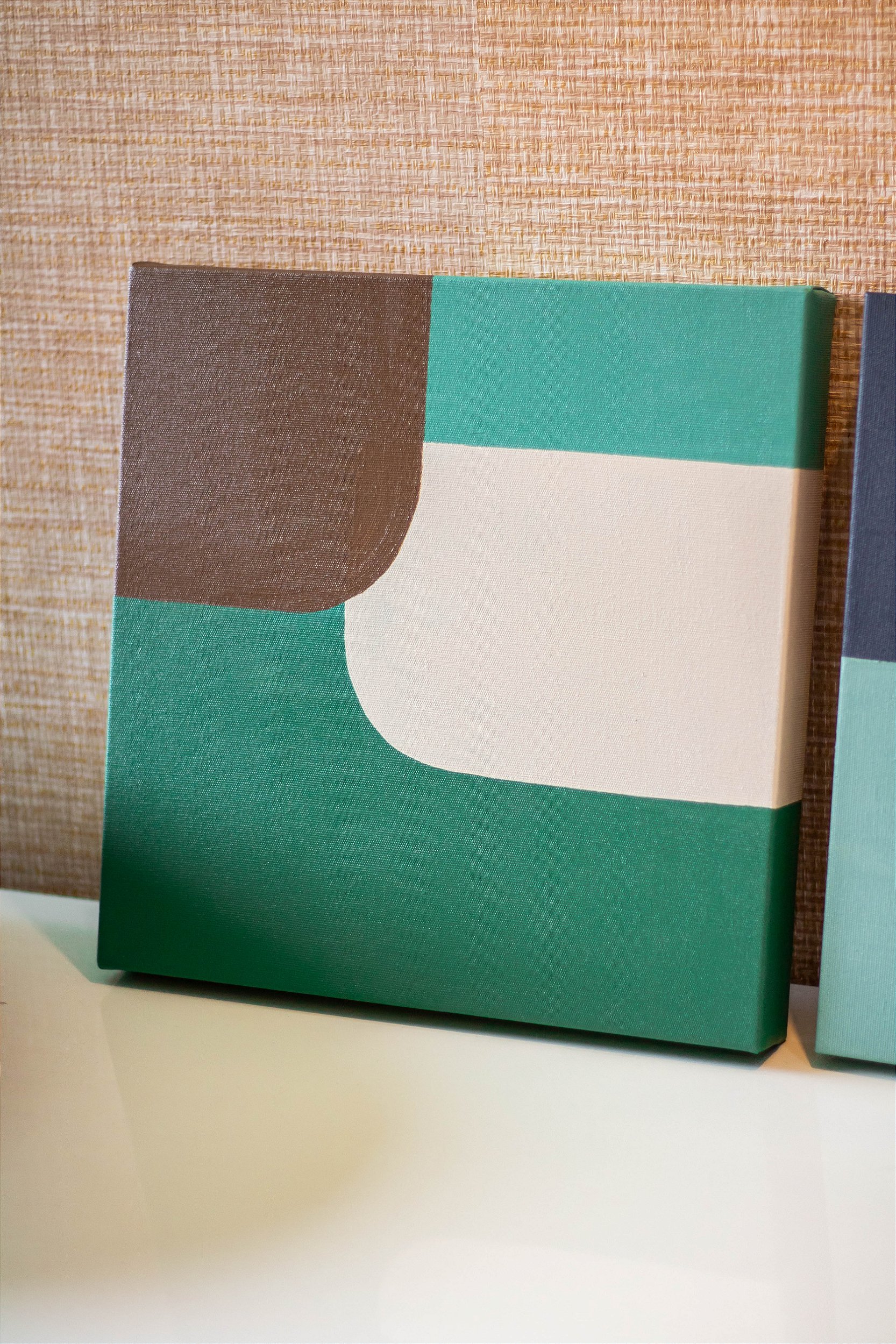Composição moderna e minimalista que combina formas geométricas e tons terrosos com verde intenso, marrom e bege claro. A pintura transmite equilíbrio e harmonia através de linhas limpas e curvas suaves, sendo perfeita para ambientes contemporâneos que valorizam design e sofisticação.