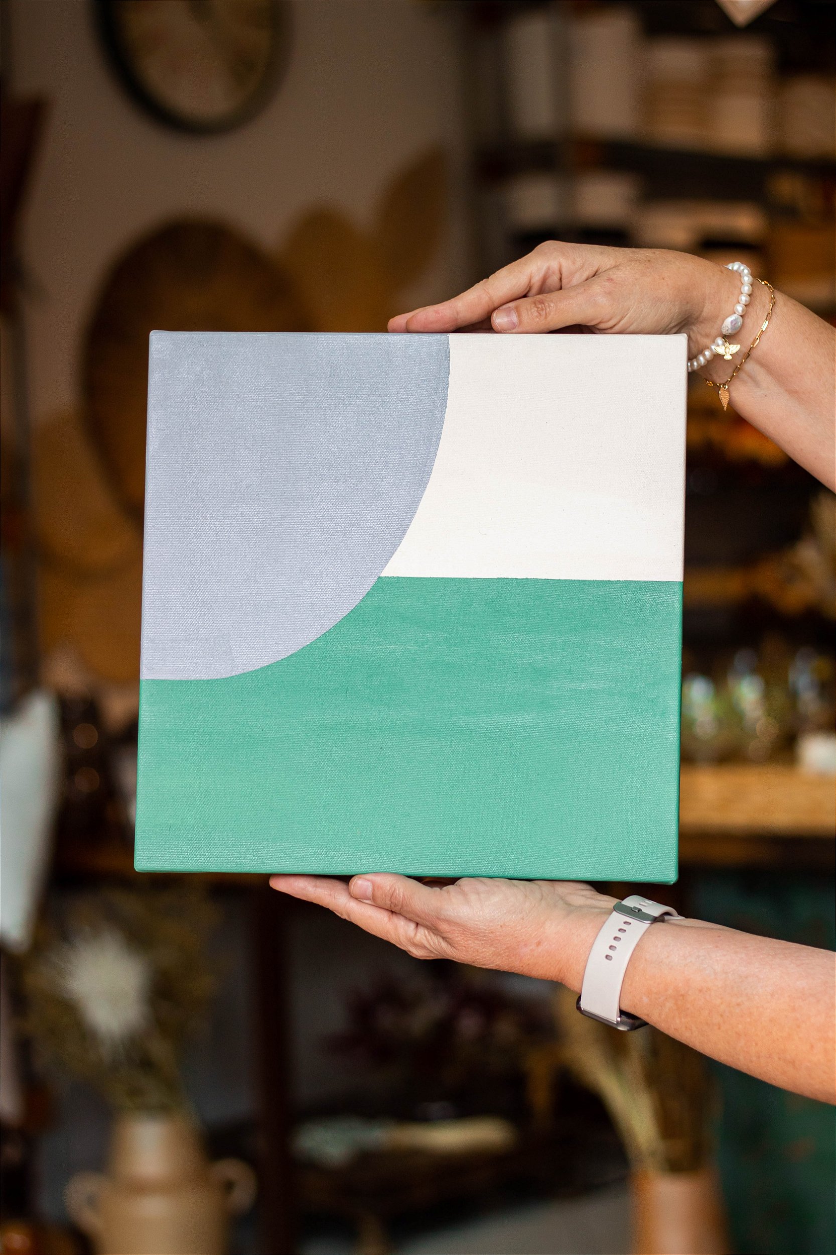 Com traços simples e composição leve, esta tela combina tons de verde, cinza e off-white em um design geométrico equilibrado. A suavidade das formas e a escolha das cores transmitem serenidade e harmonia, tornando a peça perfeita para quem busca um toque moderno e tranquilo na decoração.