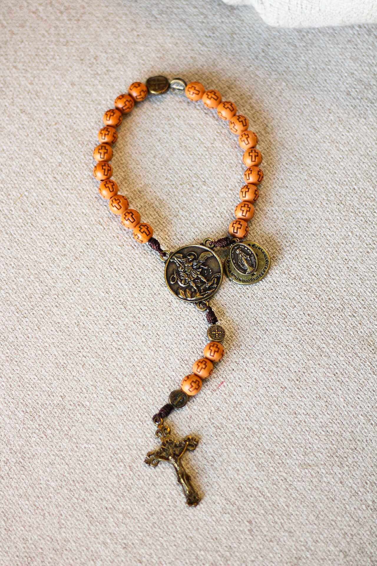 Este terço combina fé, proteção e beleza em uma peça única. Confeccionado em bolas de madeira, ele possui medalhas religiosas prateadas com detalhes delicados.
