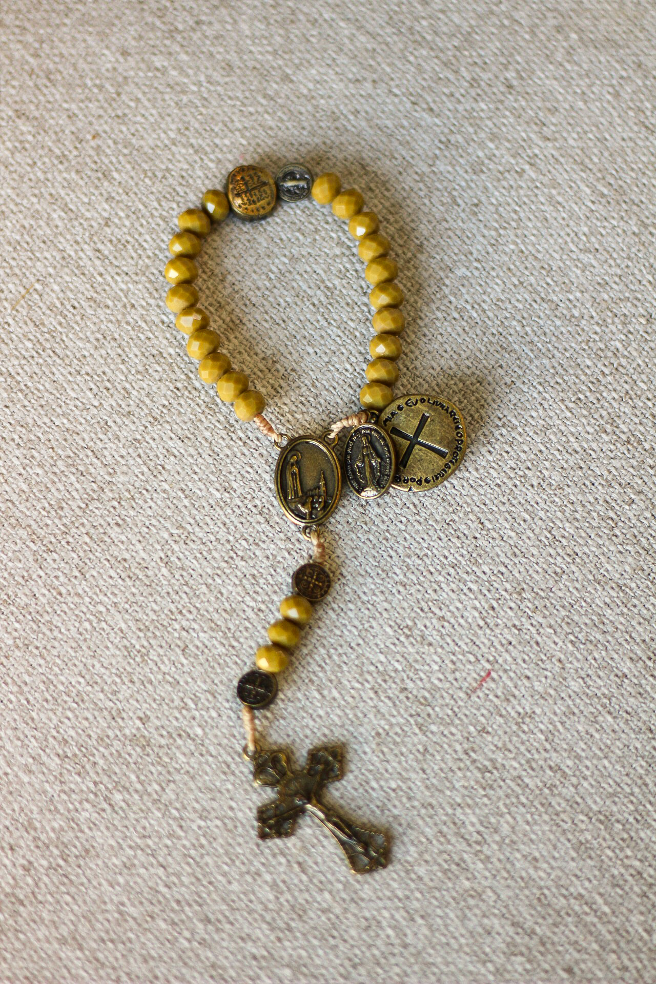 Este terço combina fé, proteção e beleza em uma peça única. Confeccionado em tom mostarda, ele possui medalhas religiosas prateadas com detalhes delicados.