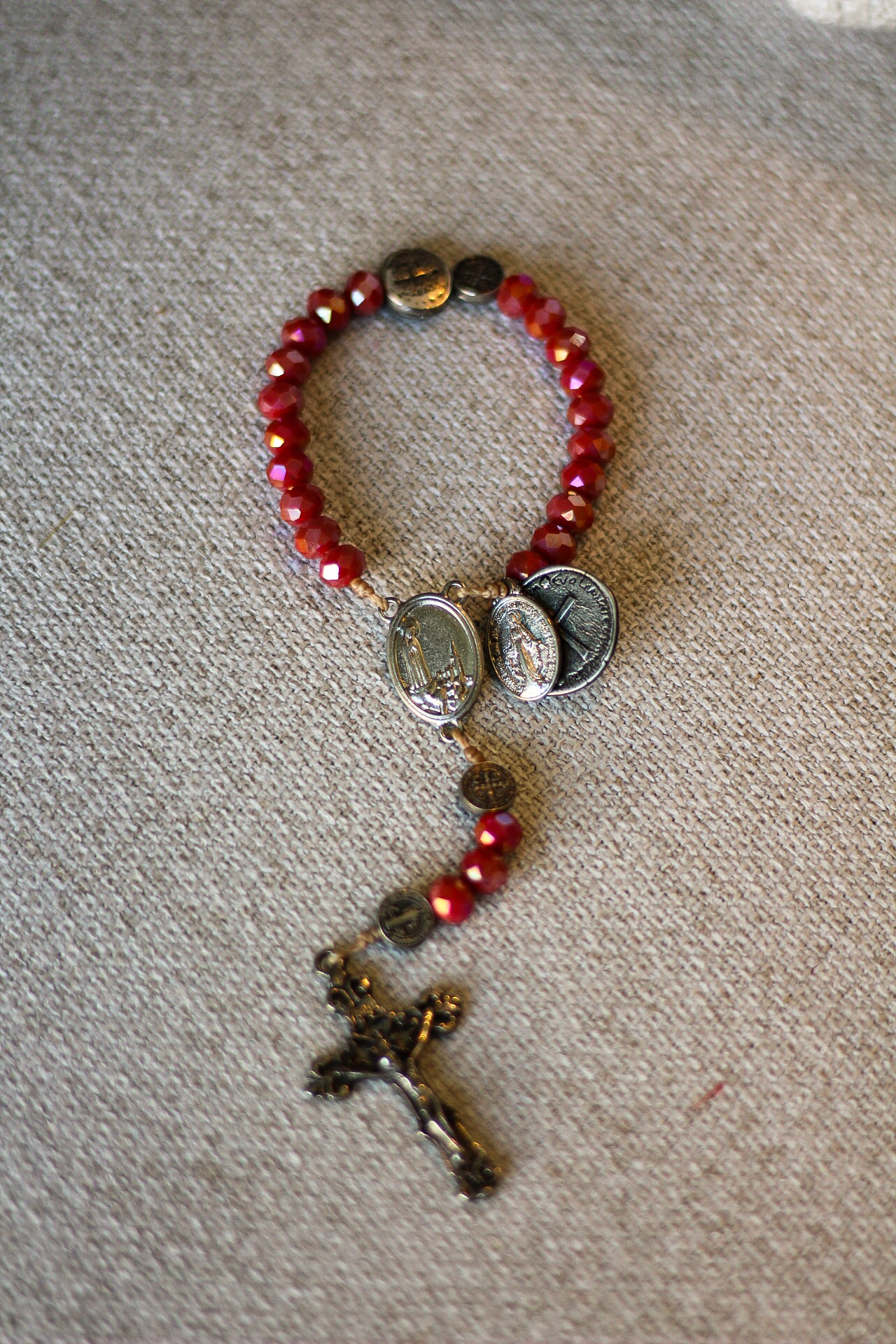 Este terço combina fé, proteção e beleza em uma peça única. Confeccionado em tom vermelho vibrante, ele possui medalhas religiosas prateadas com detalhes delicados, incluindo a medalha de Nossa Senhora e a medalha de São Bento.